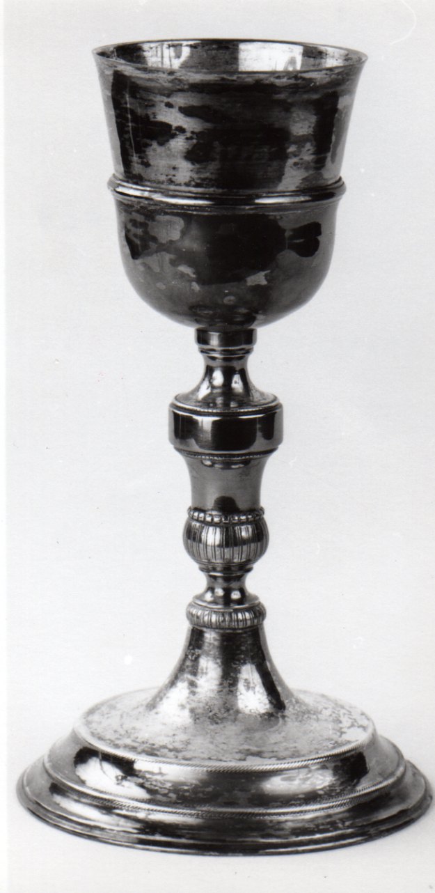 Calice in argento, realizzato a fusione; piede a sezione circolare con orlo piatto, seguito da modanature in prossimità dell'innesto del fusto; nodo a vaso, serrato tra rocchetti lisci, e con parte nferiore modellata a cipolla ed incisa. Sottocoppa privo di lavorazione e coppa
