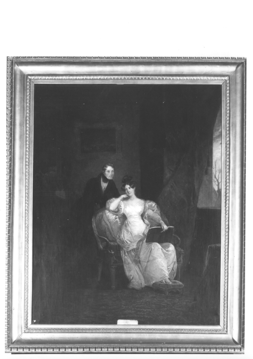 Ritratto di Maria Gropallo e del marito Carlo San Martino di San Germano, all'interno di una sala della loro abitazione. La donna è seduta su una poltrona con schienale e seduta foderati con tessuto operato e si appoggia con il gomito destro alla spalliera; con la mano sinistra regge un libro. La dama indossa un ricco abito bianco, dalle maniche a sbuffo e ampia gonna; appoggia il piede destro su un poggiapiedi di legno e velluto. Alle sue spalle, si sporge il marito, in abito scuro. La stanza è riccamente arredata: con un quadro che spicca sulla parete di fondo e dei mobili in legno sulla sinistra. Sul fondo, parzialmente nascosta da n tendaggio, si intravede una finestr, da cui si scorge il ramo di un albero e un lembo di cielo