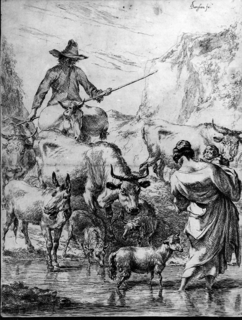 Figure: figura maschile; figura femminile; bambino. Abbigliamento. Animali: mucche; asino; pecore. Paesaggi: paesaggio con ruscello