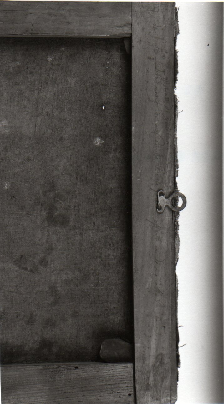 - ISCRIZIONI sul retro dell' intelaiatura - RITRATTO DI GALILEO/ DIP.O DA GIUSTO SUSTERMANS DA ME CAMILLO OFFERTO IN DONO ALLA R. ACCADEMIA DELLE SCIENZE/ IN TORINO 1739 (?) - corsivo -