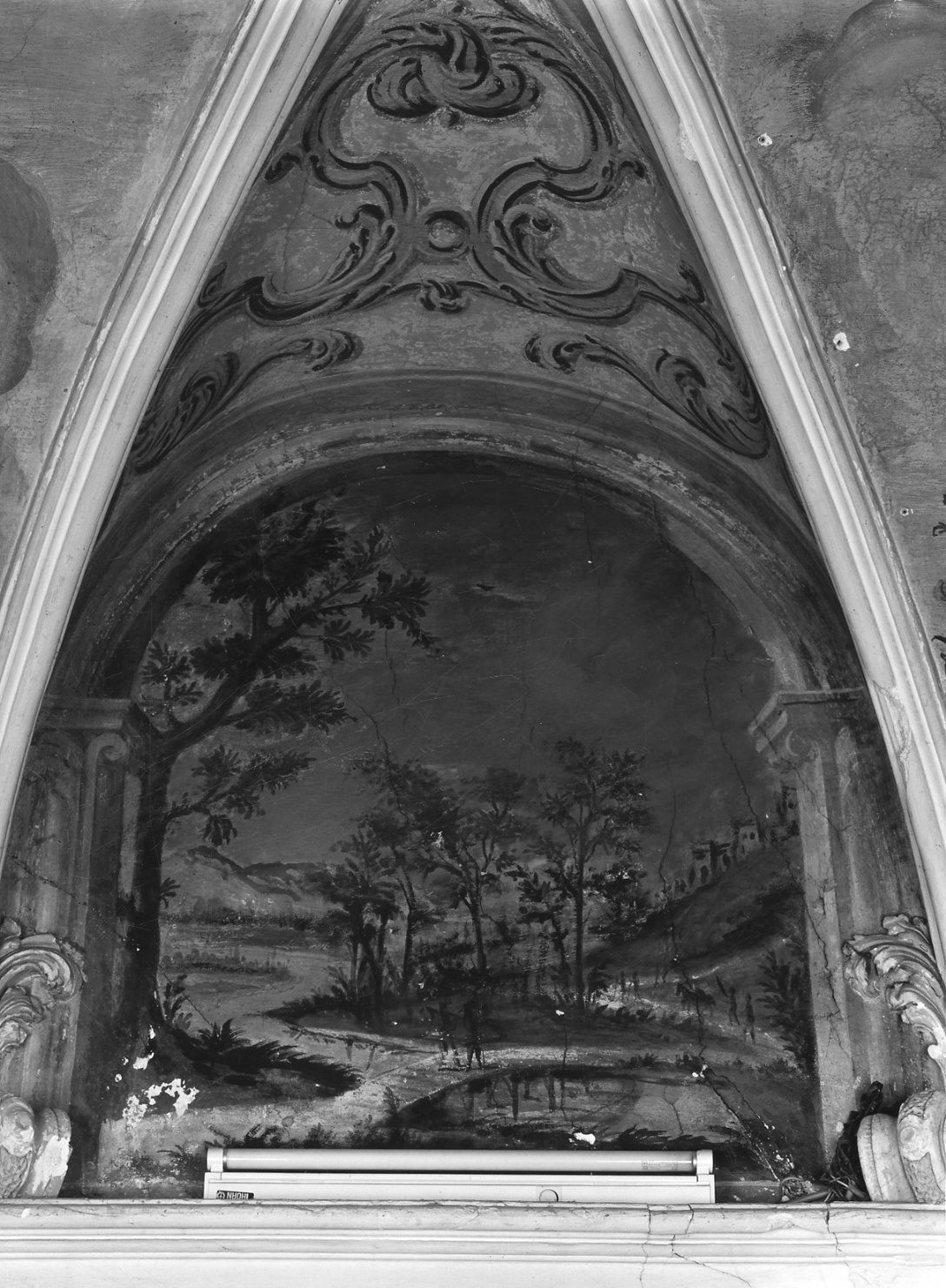- NOTIZIE STORICO CRITICHE I dipinti raffiguranti paesaggi, ornano le lunette e i fondi delle cornici a stucco della pareti, che includevano dipinti su tela (andati dispersi) sicuramente coevi alla decorazione a stucco (secc. XVII/XVIII). I paesaggi, dipinti direttamente sul vecchio intonaco, sembrano databili alla seconda metà del Settecento e non immediatamente successivi allo smantellamento dell'apparato ornamentale delle pareti. Forse la committenza degli affreschi è attribuibile ai Padri Serviti