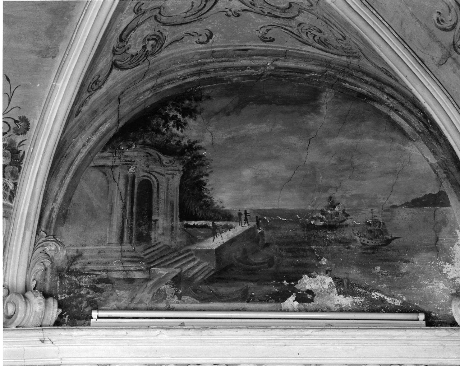 L'affresco mostra sulla sinistra un edificio dagli elementi architettonici neoclassici che si affaccia direttamente sul mare e permette l'approdo diretto per mezzo di gradini digradanti in acqua. Una banchina affianca detto edificio: alcune figure la percorrono. Nel mare, che riempie la parte restante del dipinto, si notano barche ormeggiate e velieri in lontananza navigare