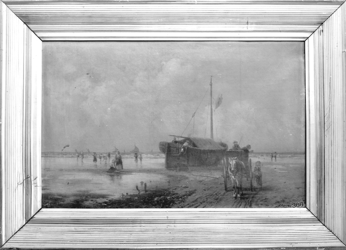 Paesaggio marino, con imbarcazione in primo piano e vele sullo sfondo; sulla destra, spiaggetta percorsa da un carro con figure a bordo