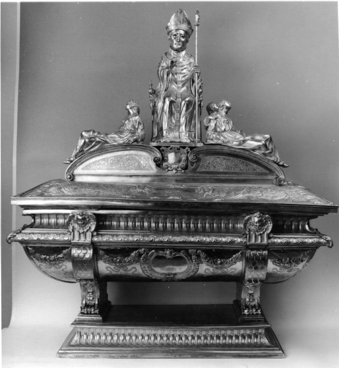 Urna argentea poggiante su piedistallo rettangolare a fascia baccellata. Decorazione con mascheroni, volute a "C" affrontate, incise, su sostegni, motivo a scaglie, festoni di frutti e testine di cherubini. Baccellatura ed elementi vegetali sulla cassa, girali d'acanto, quattro maestose cartelle sul coperchio