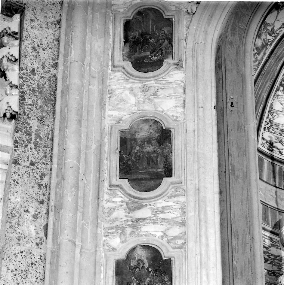 Soggetti sacri: Misteri del Rosario: Presentazione di Gesù al Tempio. Personaggi: Madonna; Gesù Bambino; San Giuseppe; dottore del Tempio. Figure: figure maschili. Abbigliamento. Interno