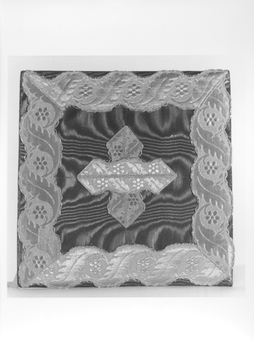 Fondo verde con marezzatura dorata con croce al centro. Gallone a torciglione smerlato con fiorellini