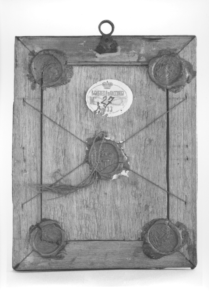 Reliquiario a tabella con cornice in legno dorato decorata da un motivo a torciglioni sottili. Sul retro sono applicati cinque sigilli in ceralacca (uno in ogni angolo ed uno al centro); la placchetta in legno che chiude il retro del reliquiario è assicurata con due spaghi che si incrociano al centro e sono chiusi dal sigillo di ceralacca