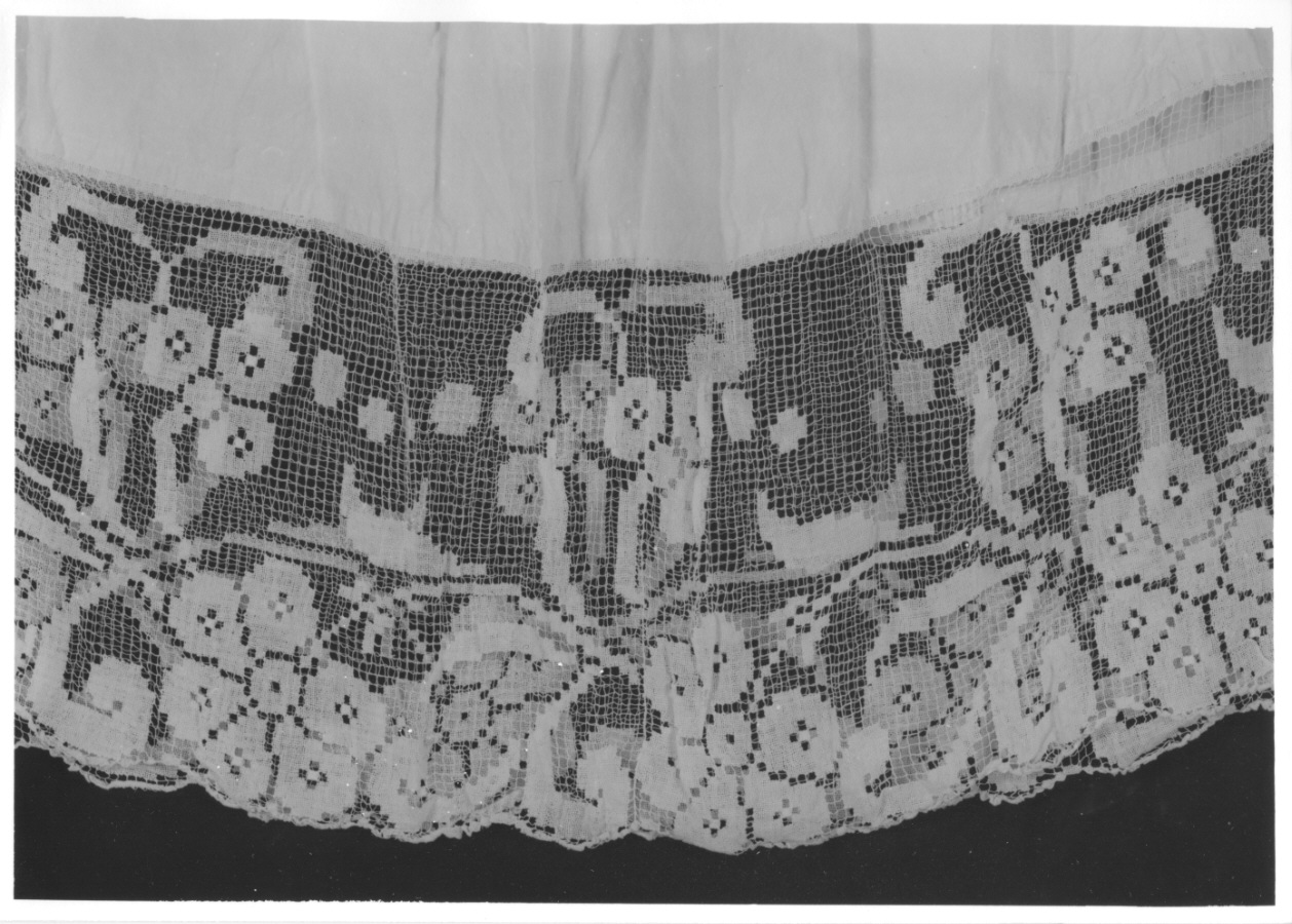 Camice in cotone bianco; i bordi della veste e delle maniche sono rifiniti da un pizzo di cotone con decoro a tralci vegetali terminanti a ricciolo con grandi fiori e foglie