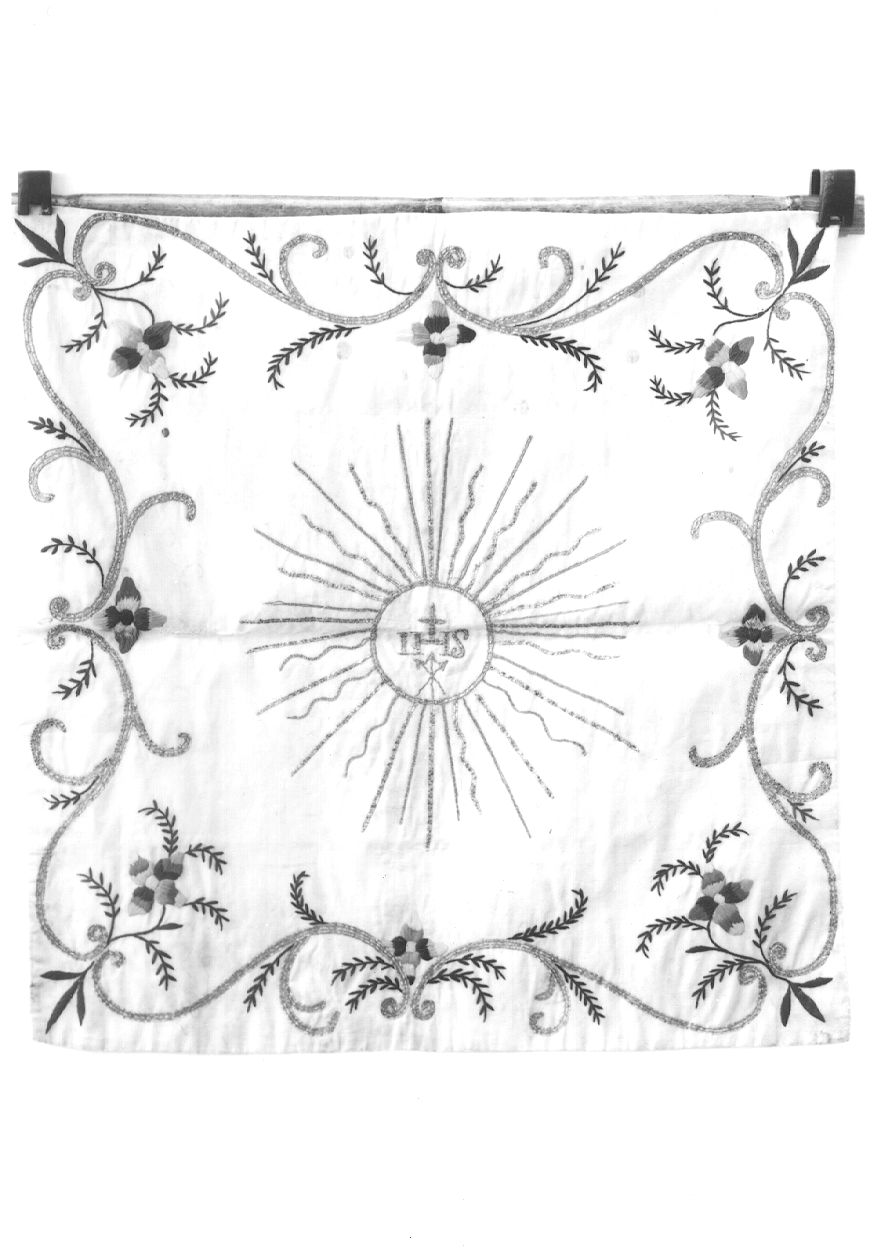 In taffetas color avorio, è ricamato con filati di seta policromi e filo dorato con motivo di volute dorate con fiorellini quadripetali su tutti i lati, intorno al monogramma cristologico raggiato, al centro. Fodera in taffetas rosa
