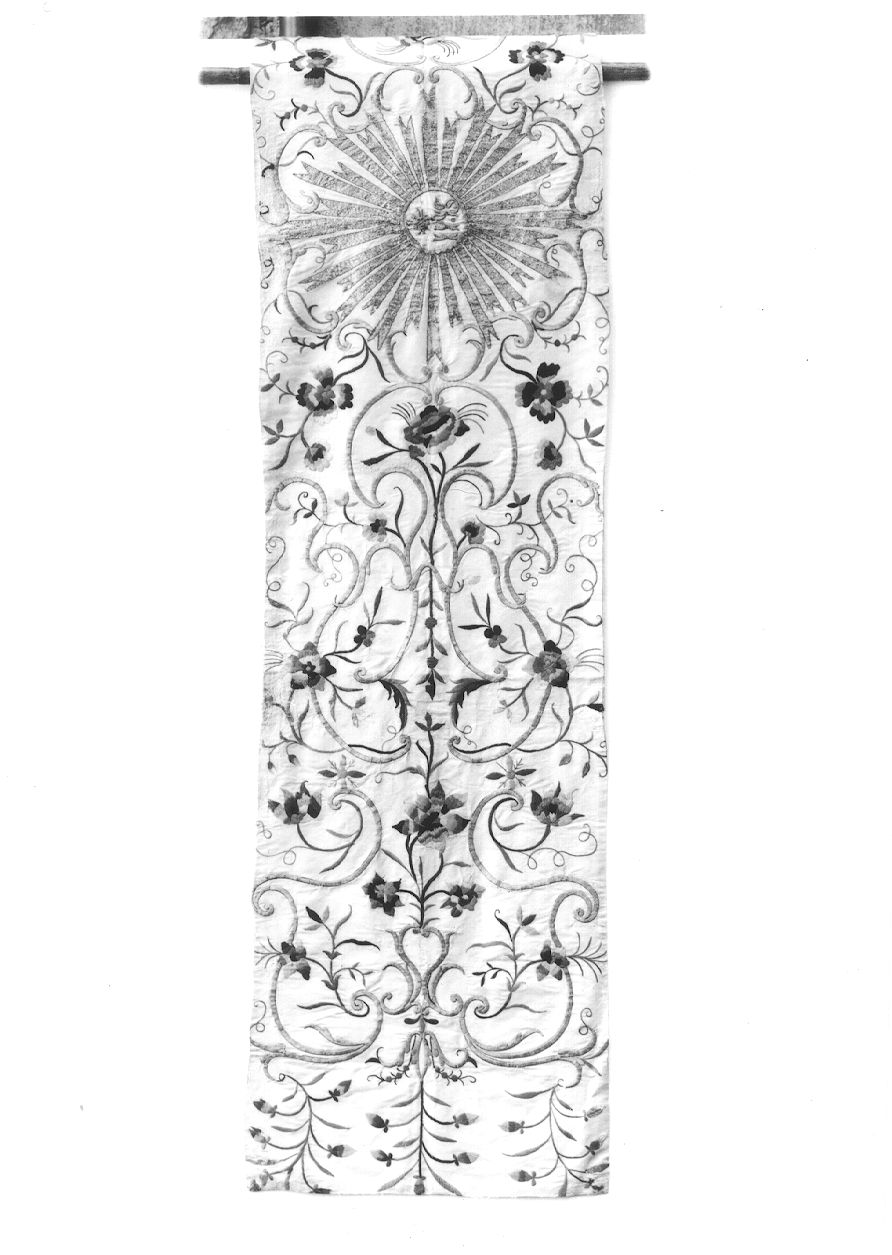 Telo rettangolare in taffetas color avorio, ricamato con filati di seta policromi e filo dorato secondo un motivo di volute dorate e fiori. Al centro il monogramma cristologico raggiato. Fodera in tela cerata rosa