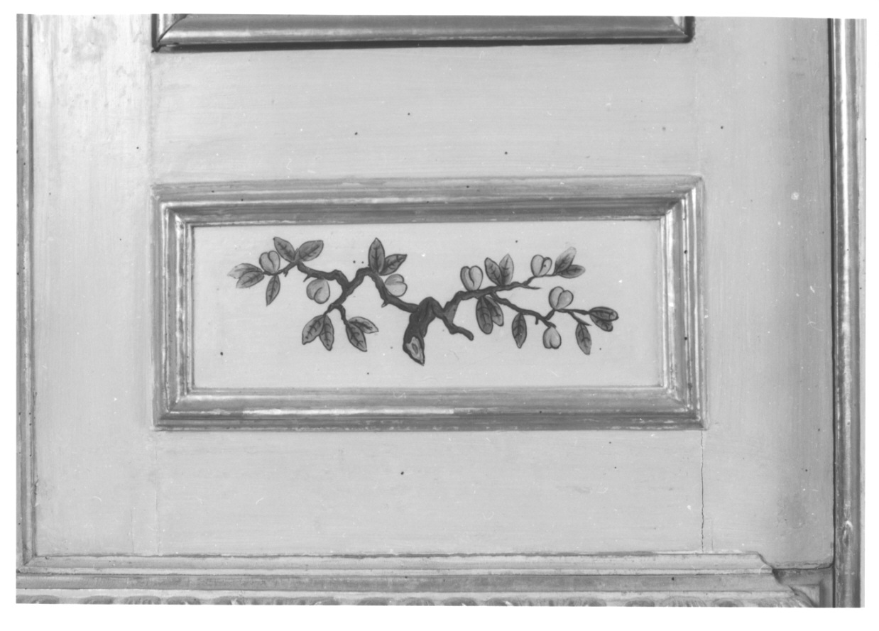 Pannello di boiserie lignea dipinto con uccelli, rocce e motivi fitomorfi secondo il gusto orientaleggiante, entro cornice lignea intagliata dorata
