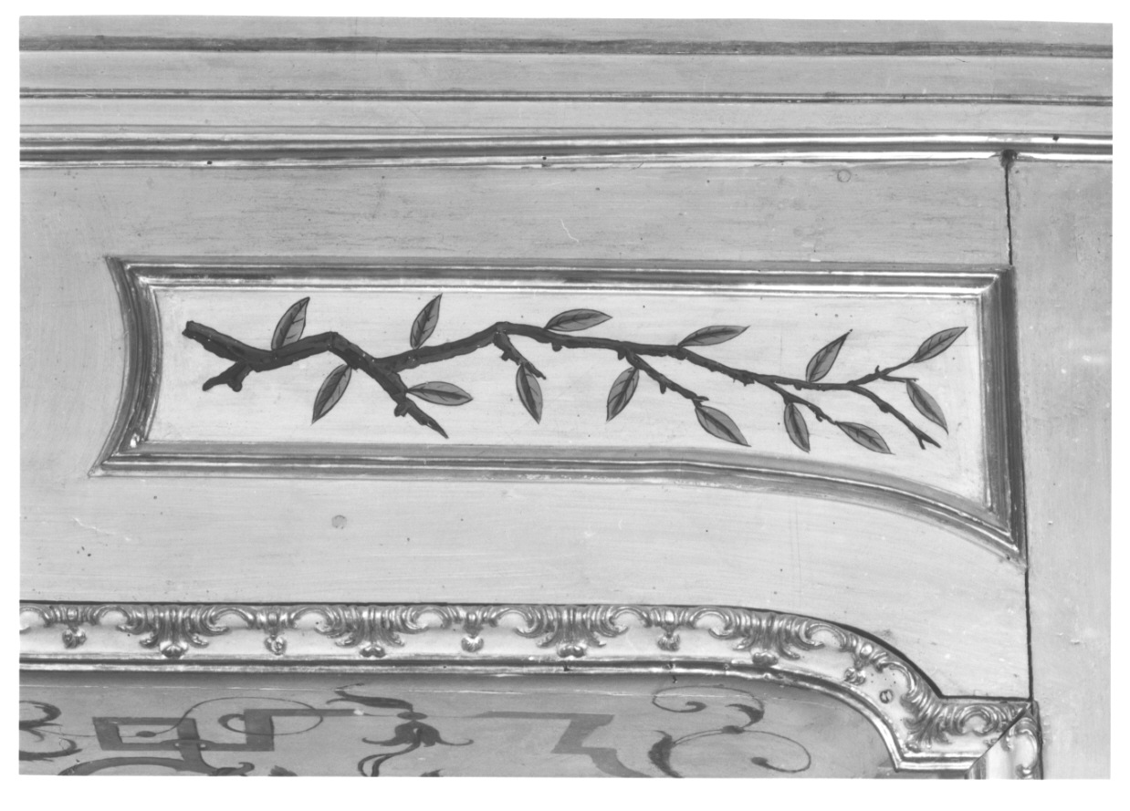 Pannello di boiserie lignea dipinto con uccelli, rocce e motivi fitomorfi secondo il gusto orientaleggiante, entro cornice lignea intagliata dorata