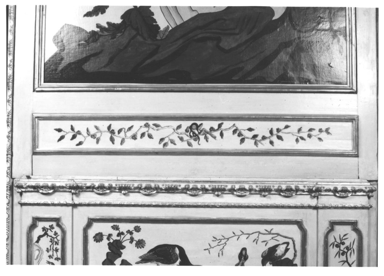 Pannello di boiserie lignea dipinto con uccelli, rocce e motivi fitomorfi secondo il gusto orientaleggiante, entro cornice lignea intagliata dorata