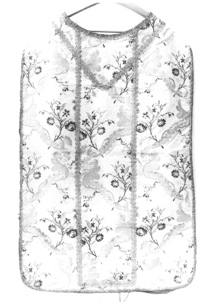 A fondo avorio con disegno a meandri di trine dorate e argentate e mazzolini di fiori, è profilata con galloni eseguiti a fuselli in filo e lamina dorati e reca fodera in taffetas verde. Tessuto: fondo gros de Tours prodotto da ordito e trama in seta avorio; il disegno è prodotto dalle slegature di una trama color avorio lanciata ogni 4 colpi e legata sul rovescio da un ordito apposito disposto nella proporzione di 1: 4 rispetto a quello di fondo, oltre che da trame broccate a colpi alterni in seta verde, azzurro chiaro e scuro, blu, rosa chiaro, rosa antico, vinaccia, rosa carne, giallo, rosso, verde chiaro, filo dorato (anima in seta albicocca), oro riccio, argento riccio, lamina argentata e dorata