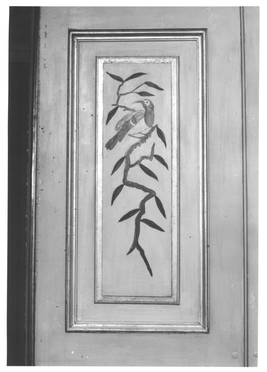Pannello di scuro di finestra dipinto a motivi decorativi vegetali e uccelli di gusto orientaleggiante