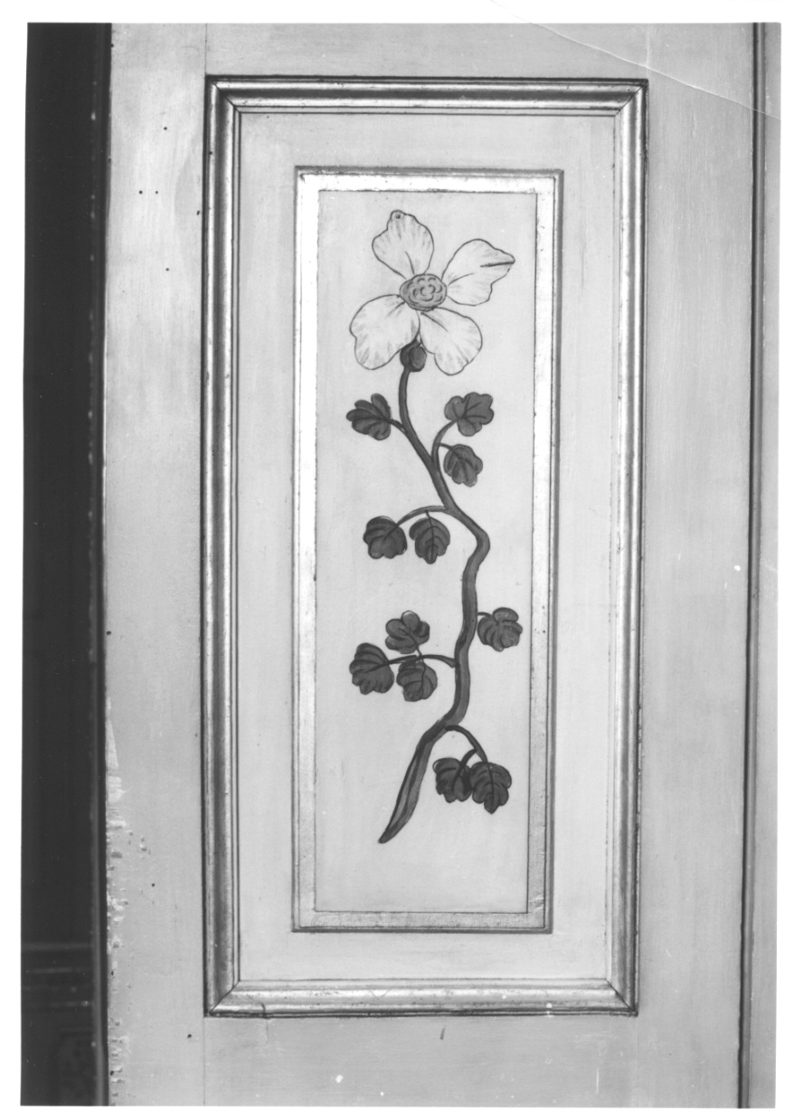 Pannello di scuro di finestra dipinto a motivi decorativi vegetali e uccelli di gusto orientaleggiante