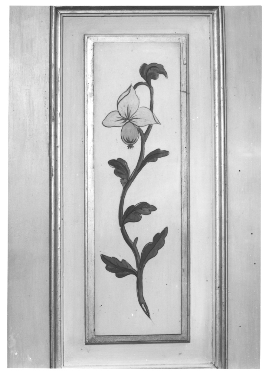 Pannello di scuro di finestra dipinto a motivi decorativi vegetali e uccelli di gusto orientaleggiante