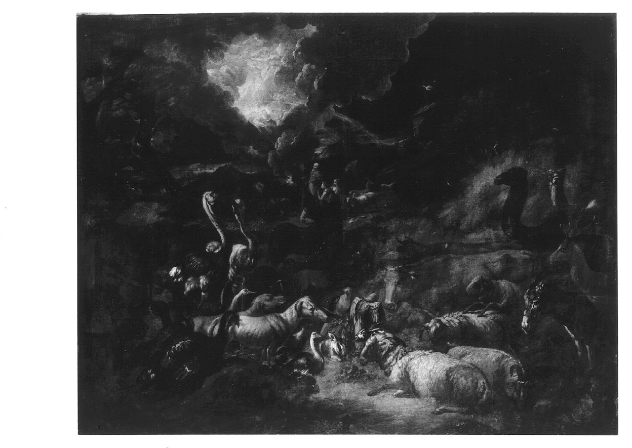 - NOTIZIE STORICO CRITICHE Corrisponde al dipinto registrato al n. 59 dell'Inventario 1869 come "Scuola genovese. Arca di Noé" (n. 40, inv. 1828; n.118, inv. 1833: n. GABRIELLI, Inventario degli oggetti d'arte esistenti nella R. Accademia Albertina di Belle Arti in Torino, in "Bollettino Storico-Bibliografico Subalpino", anno XXXV, n. III, 1933, p. 189). Il n. 165 presente sul retro della tela non è compreso tra i numeri dei quattro diversi cataloghi controllati dalla Gabrielli. Proviene dalla Collezione Mossi di Morano dove era riferito al Tempesta (Don. Mossi n. 40: L. C. BOLLEA, La donazione Mossi di Morano alla R. Accademia Albertina, in "Bollettino Storico- Bibliografico Subalpino, anno XXXIV, n. 1, Torino 1932, p. 310). La commissione del 1869 lo attribuiva al Tempestino, mentre la Gabrielli lo collocava in ambito seicentesco genovese; la tela era esposta in Accademia nella Sala VIII (n. GABRIELLI, 1933, p. 179; n. GABRIELLI, La Regia Galleria dell'Accademia Albertina, n. 28. Itinerari dei Musei e Monumenti d'Italia, Roma 1933, p. 14)