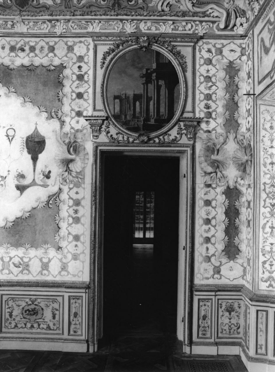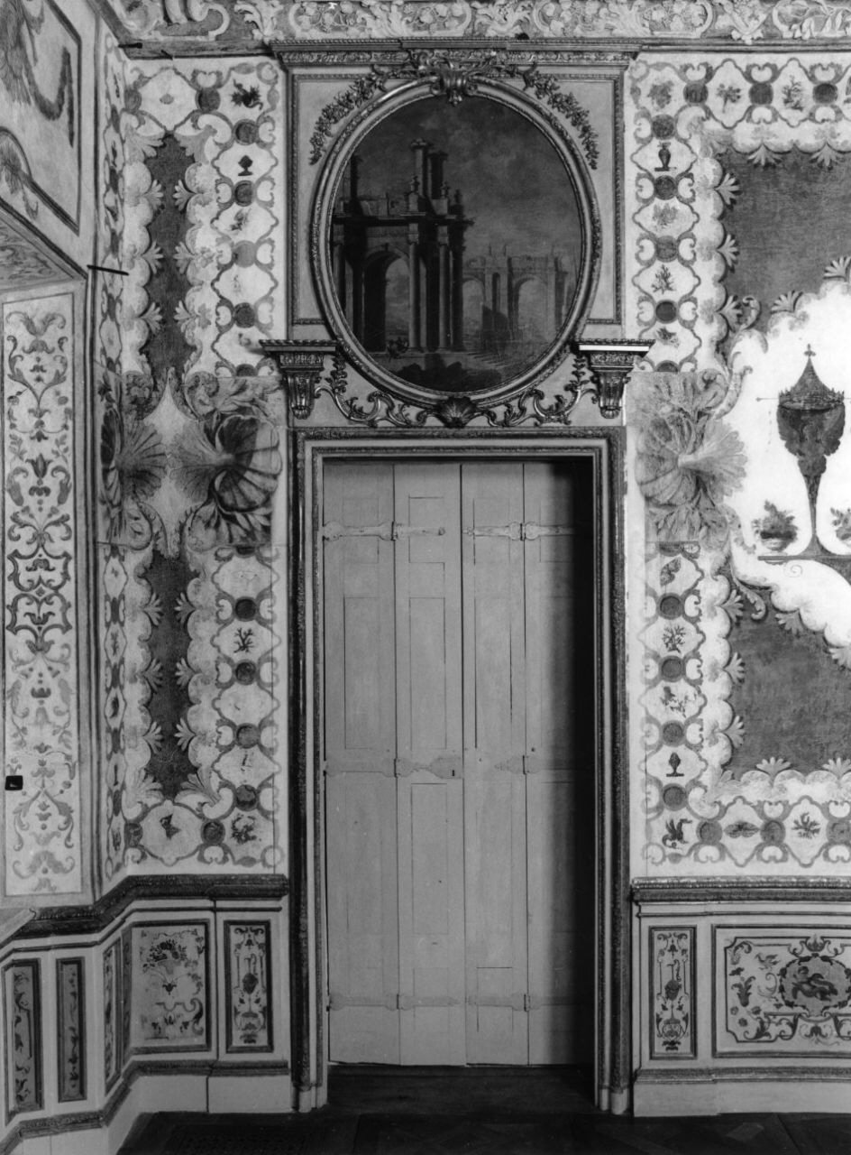 Le cornici di sovrapporta, di formato rettangolare con apertura ovale per i dipinti, sono ornate nella parte inferiore da due mensole dorate laterali, al centro da una conchiglia intagliata e in alto da festoni vegetali