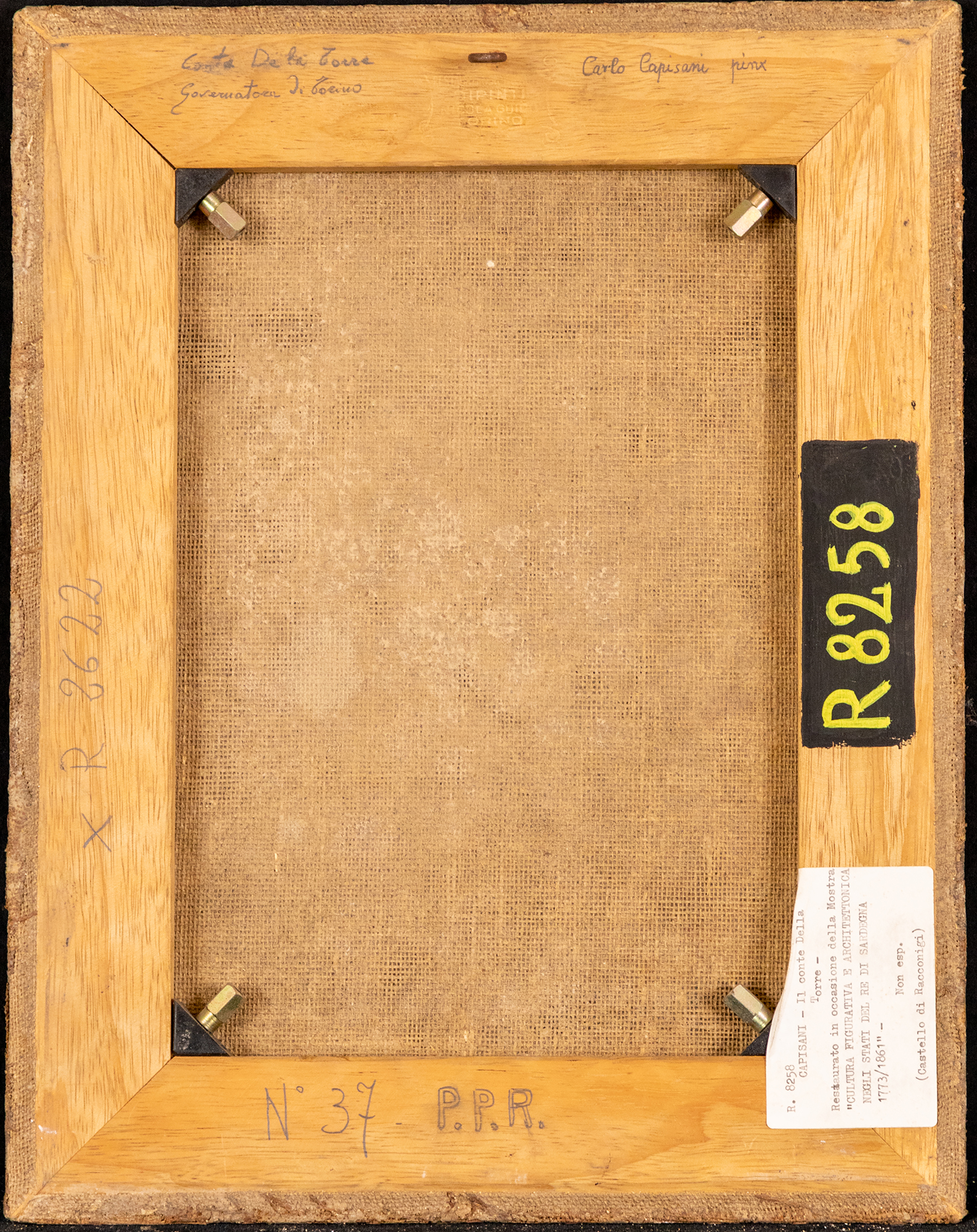 - NOTIZIE STORICO CRITICHE L'opera ( pubblicata da Marco Rosci nel 1980 in occasione della mostra "Cultura figurativa e architettonica negli Stati del Re di Sardegna 1773-1861", scheda 376, p. 402) è il bozzetto per il ritratto di Sallier de La Tour, governatore di Torino, comandante delle truppe "fedeli" nel 1821 e ministro degli esteri di Carlo Felice, realizzato nel 1841 da Capisani per il Palazzo Ducale di Agliè, su commissione di Maria Cristina, moglie di Carlo Felice dal 1807. Questo ritratto inaugurava la serie di 72 ritratti dei Cavalieri dell'Annunziata commissionato dalla vedova per la Galleria della Chiesa ad Agliè con l'intento di rievocare e tramandare fatti e vicende di Carlo Felice. Per la biografia del pittore, forse torinese, si veda la voce Capisani Angelo di Rosci M. nel catalogo della mosra, vol. III, p. 1417.; Il rintelo ha cancellato la firma, il titolo e i numeri d'inventario originali, riportati sul telaio con un errore circa il nome del pittore. Sono presenti la sigla in giallo, del 1951, mantenuta nel 1955, e il numero preceduto da XR, che dovrebbe corrispondere ad un'inventario tra il 1933 e il 1951.; Dal 1982 l'opera si trova nella localizzazione attuale; prima di questa data era in un deposito situato nei pressi di un corso d'acqua, possibile causa del deterioramento