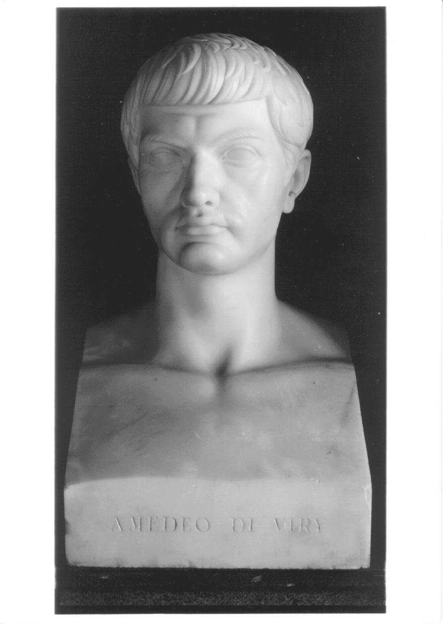 - NOTIZIE STORICO CRITICHE Nel 1840 Cesare Saluzzo compilò per il re Carlo Alberto un elenco di "Personaggi illustri nazionali per soggetti di quadri, busti, ritratti" (SBAS TO) e questa lista fornì i soggetti per la serie di venti ritratti raffiguranti condottieri illustri di storia patria medioevale e moderna eseguiti da vari autori nel corso degli anni quaranta per essere posti nella Rotonda delll'Armeria, dove li descrive C. Rovere nel 1858. Le erme vennero rimosse nel 1874 e l'inventario di Palazzo Reale del 1881 ne registra sei nel Guardamobili, mentre quello del 1911 le menziona al secondo piano, quattro nel Guardaroba e due nell'Appartamento del Principe ereditario, nella sala attigua alla scala dei Principi; non sono citate nell'inventario del 1966. Oggi i sei busti (schede nn. 130-135) sono esposti nell'Appartamento del Re al piano terra, mentre i restanti sono immagazzinati nelle cantine di deposito di Palazzo Carignano. Il busto di Amedeo di Viry, condottiero savoiardo del XIV secolo, è opera dello scultore torinese Luigi Cauda, che studiò all'Accademia Albertina ed espose, come ritrattista, alla Promotrice di Torino; sue opere si conservano al Castello di Racconigi. In una lettera da Roma in data 23 novembre 1843 lo scultore scrive di aver terminato il busto (cfr. scheda documenti n. 121508 di S. Ghisotti). Cfr. Casa di S.M., Cartelle, mazzo 2457, 1843, 23 novembre, fasc. 8/ 33 (1059)