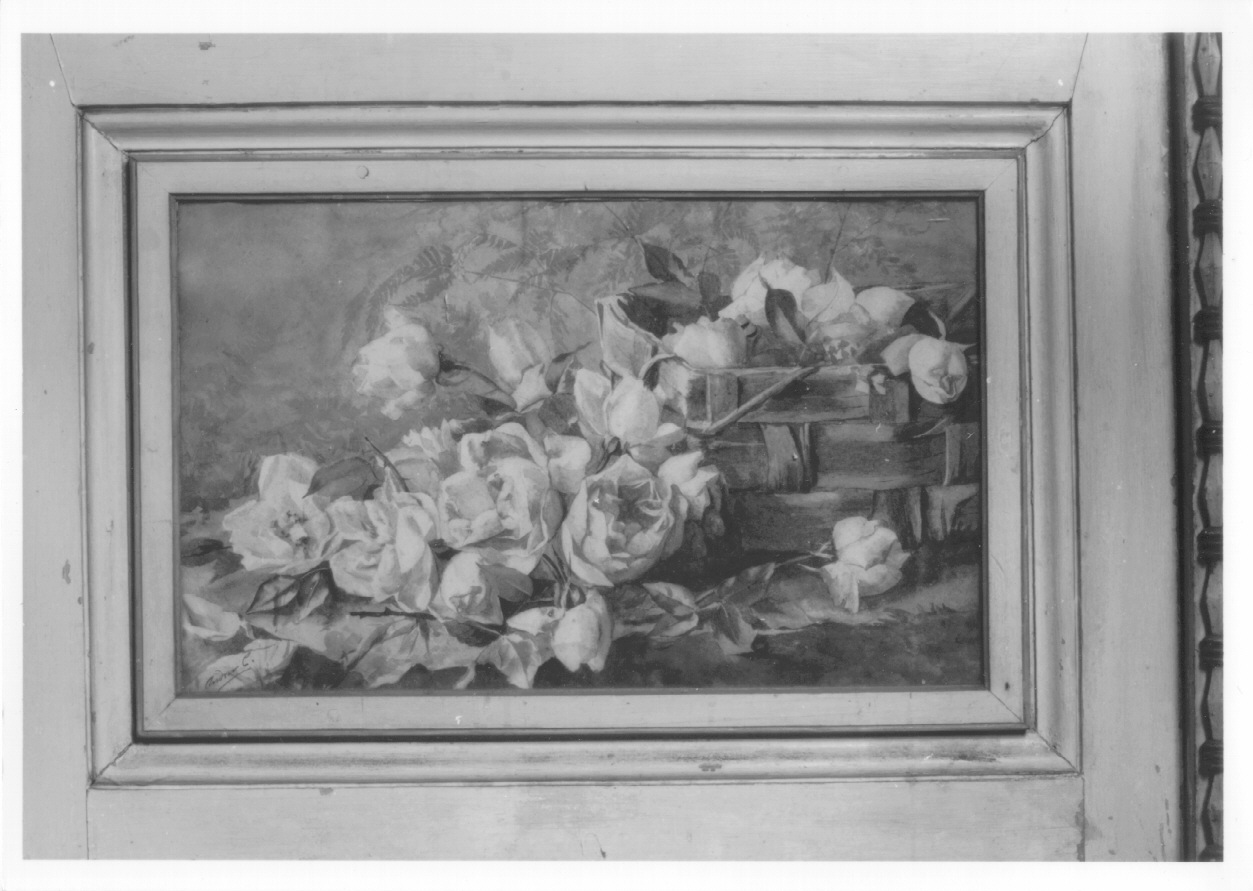 - NOTIZIE STORICO CRITICHE Il bagno venne allestito quando l'appartamento era abitato da Maria Letizia Napoleone (1866- 1926), che vi si insediò nel 1890, anno in cui rimase vedova del duca Amedeo d'Aosta. Le date che compaiono nei pannelli dipinti con fiori del lambriggio, delle porte e degli armadi sono scalate dal 1896 al 1900 e la firma è, a parte pochi dipinti, quella di Emma Biscarra (1863- 1901), delicata pittrice torinese specializzata in fiori. Questo pannello è firmato da un certo Andrea C. , al momento non identificato