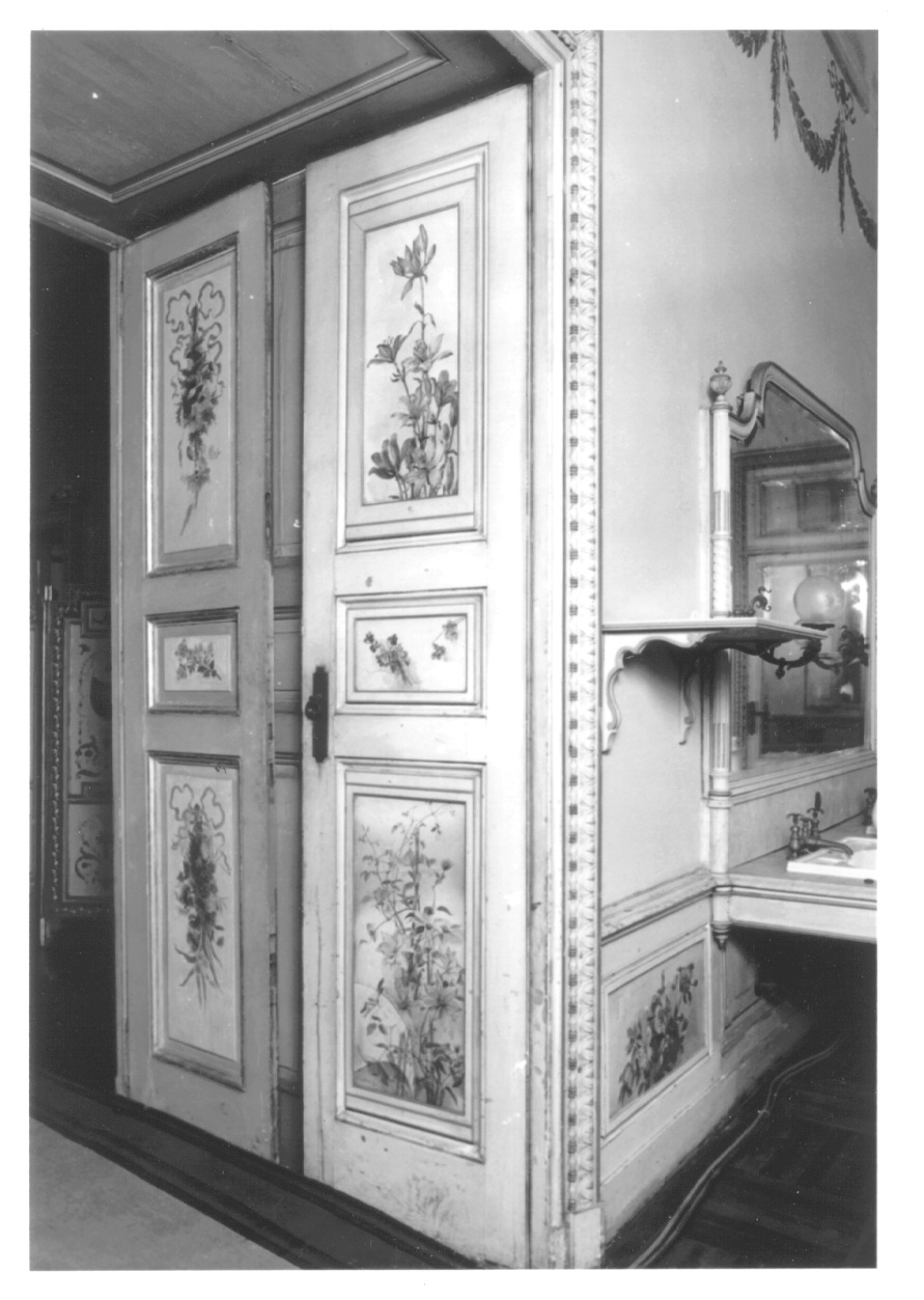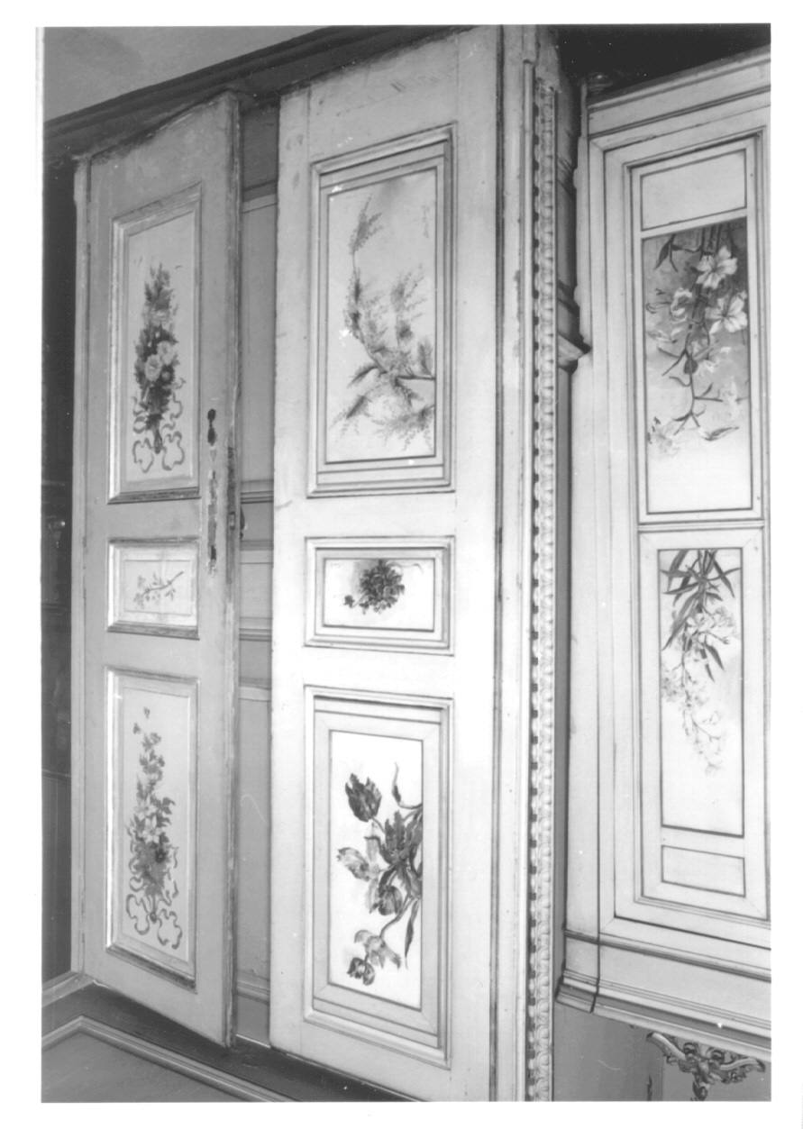 Ogni battente della porta, dipinto in bianco con profili verdini, comprende tre pannelli dipinti a fiori