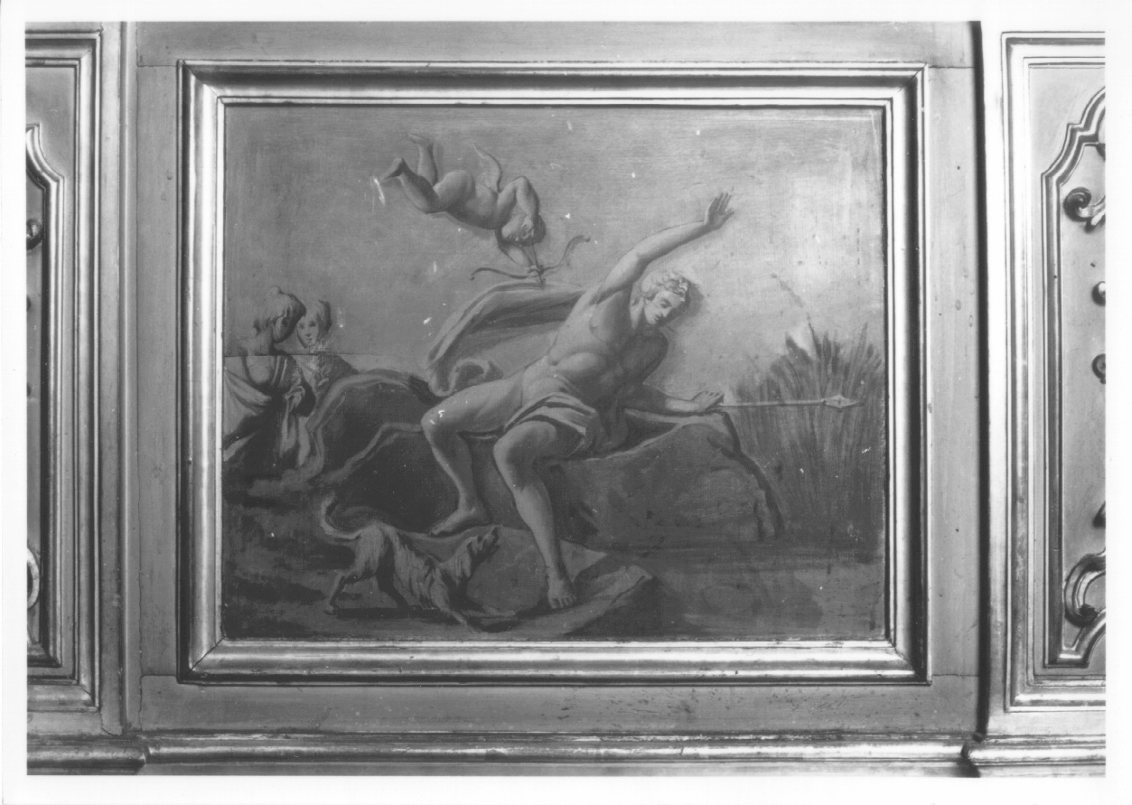 - NOTIZIE STORICO CRITICHE Il fregio di questa sala, detta anche delle Guardie del Corpo, delle Dignità o dei Gentiluomini arcieri, non è documentato nella Descrizione del Palazzo Reale di Torino di Clemente Rovere (pp. 106-109 e 191-193), essendo successivo al 1858; l'erudito non si sofferma neppure sul suo possibile precedente. Sempre secondo il Rovere, intorno alla metà del XIX secolo la stanza (luogo deputato per l'esposizione delle salme dei regnanti) dovette subire sostanziali interventi sia nulle dimensioni che sugli apparati decorativi: circa il 1840 venne tramezzata ai fini della realizzazione una scala parallela a quella delle Forbici; il soffitto venne ricostruito nel 1844; nel 1847 Francesco Gonin dipinse i dodici campi del fregio; ad un momento successivo, ancora di XIX secolo, andrà ricondotto il lambriggio, i cui dati stilistici e qualità pittoriche rimandano all'attività di una equipe di pittori legata alle fortunate scenografie teatrali di quegli anni (F. VARALLO, Pittori e sceonografi nei teatri dell'Ottocento, in F. VARALLO (a cura di), Teatri storici. Luoghi dello spettacolo in Piemonte dalla corte settecentesca al decoro della città moderna, Torino 1998, pp. XIV-XVII). ; Andreina Griseri definiva lo zoccolo come "ispirato a rilievi antichi", datandolo agli ultimi decenni del XVIII secolo (A. GRISERI in V. VIALE (a cura di), Mostra del Barocco piemontese, Torino 1963, p. 30)