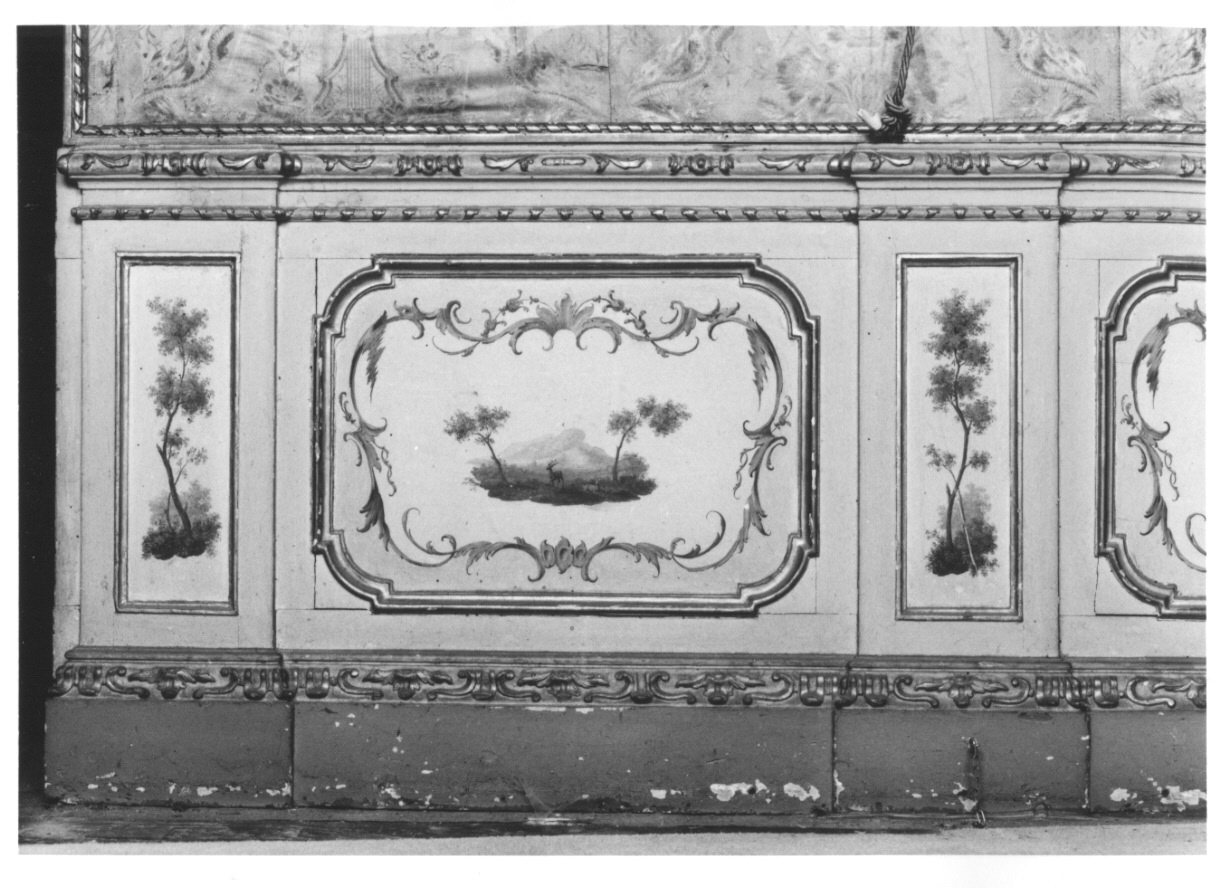 - NOTIZIE STORICO CRITICHE APPARTAMENTO DI LEVANTE (già appartamento del Duca di Chiablese); SFONDATO DI PREGHIERA, DETTO SALETTA DEL PREGADIO; Sono opera di Giovanni Battista Alberoni (Modena?, ca. 1700 - Torino, ca. 1785) l'affresco della volta, i pannelli delle porte volanti, i lambriggi (zoccolo) e le imposte delle finestre, risalenti al 1753; Le tre sovrapporte documentate al 1751-52 si devono a Pietro Domenico Olivero (Torino, 1679 - 1755); La sovrapporta su cui è dipinta la Caccia al lupo è di Francesco Bolgié (Torino?, notizie dal 1763 al 1766), databile presumibilmente al 1763; La decorazione della porta dello sfondato del muro si deve a Giovanni Pietro Pozzo (Milano, 1713 - Torino, 1798); Pietro Piffetti (Napoli?, ca. 1700 - Torino, 1777) eseguì il pregadio nel 1758, su probabile disegno di Benedetto Alfieri (Roma, 1700 - Torino, 1767); la ghirlanda in bronzo cesellato, a decoro del fastigio del pregadio è di Francesco Ladatte (Torino, 1706 - 1787).; La scrivania in radica bionda di noce con alzata a motivi intarsiati di palmette classicheggianti è databile 1770-80; (Apparato didattico elaborato per l'Ordine Mauriziano da S. Damiano a cura di C. Mossetti e C. Bertolotto)