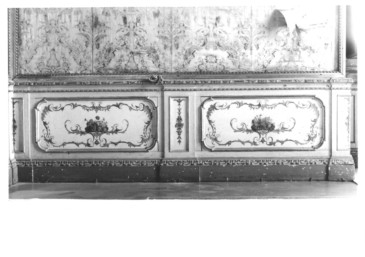Zoccolo in legno intagliato, dipinto e dorato. Pannelli recanti composizioni floreali entro cornici rocaille
