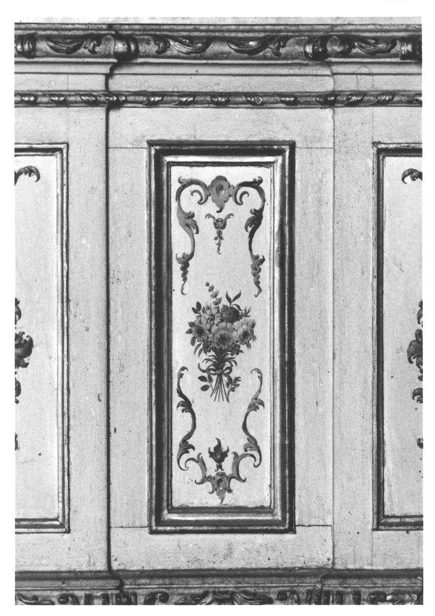 Zoccolo in legno intagliato, dipinto e dorato. Pannelli recanti composizioni floreali entro cornici rocaille