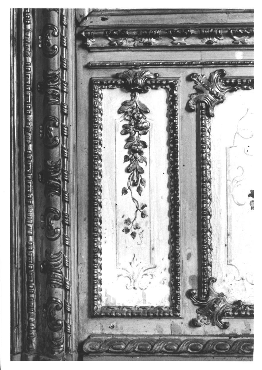 I pannelli di zoccolo sono dipinti a tralci fioriti entro cornice rocaille