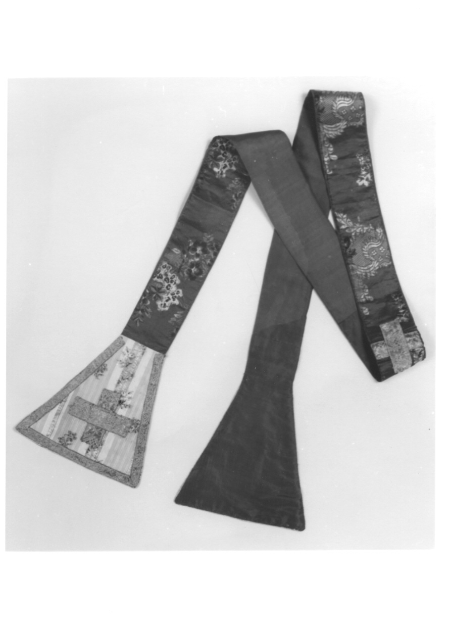 - NOTIZIE STORICO CRITICHE Il pekin è databile all'ottavo decennio del Settecento, come si deduce dal motivo decorativo del tessuto, impostato su una rigida composizione impostata sull'alternanza di righe verticali impreziosite da piccoli elementi vegetali dai toni tenui e chiari, e dall'impiego della tecnica del pekin. La stoffa può essere avvicinata con la pianeta conservata presso il Museo Diocesano Tridentino (D. Devoti, D. Digilio, D. Primerano, Vesti liturgiche e frammenti tessili nella raccolta del Museo Diocesano Tridentino, Trento 1999. pp. 164-165, scheda n. 114 di D. Digilio), con il frammento di telo conservato presso il Poldi Pezzoli di Milano (A. Mottola Molfino, Tessuti, in Museo Poldi Pezzoli. Tessuti-Sculture-Metalli islamici, Milano 1987, p. 71 scheda n. 146), con il frammento della colezione Keir (M. King, D. King, The Keir Collection. European Textiles in the Keir Collection 400 B C to 1800 A D, Londra-Boston 1990, p. 287, n. 220), col telo della Collezione Antonio Ratti (C. Buss, Collezione Antonio Ratti. Seta Oro e Argento. Le sete operate del XVIII secolo, Milano 1992, p. 128), con la pianeta della chiesa di Santa Maria degli Angeli a Feltre (G. Ericani, P. Frattaroli (a cura di), Tessuti nel Veneto. Venezia e la Terraferma, Verona 1993, pp. 487-488, scheda n. 159 di P. Frattaroli e di P. Carboni) e con la pianeta conservata presso la Chiesa di Sant'Andrea a Siena (M. Ciatti (a cura di), "Drappi, velluti, taffetà et altre cose". Antichi tessuti a Siena e nel suo territorio, catalogo della mostra, Siena 1994, p. 201, scheda n. 130 di G. Palei).; In assenze di testimonianze documentarie, non si può indicare con precisione se il tessuto, probabilmente destinato all'abbigliamento, sia stato realizzato in Francia o in Italia