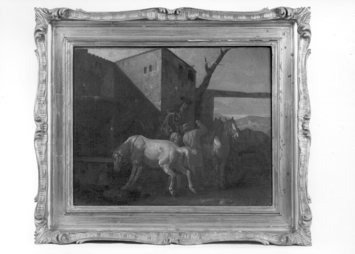 La scena è ambientata all'aperto; si vedono dei palazzi dall'aspetto austero illuminati dal sole. In primo piano, alcuni uomini, uno dei quali ancora in sella, accudiscono dei cavalli e li fanno abbeverare. Cornice in legno intagliato e dorato con profilo mosso