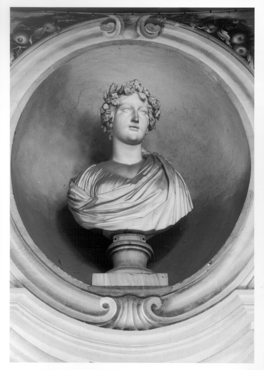 Mezzo busto di Pomona in marmo bianco scolpito; base in marmo grigio