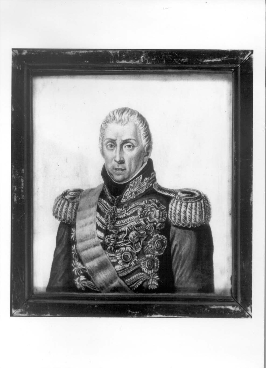 L'uomo indossa l'uniforme militare con spalline e decori dorati, su cui sono appunate numerose decorazioni. Porta i capelli tagliati corti. Cornice liscia in legno scuro