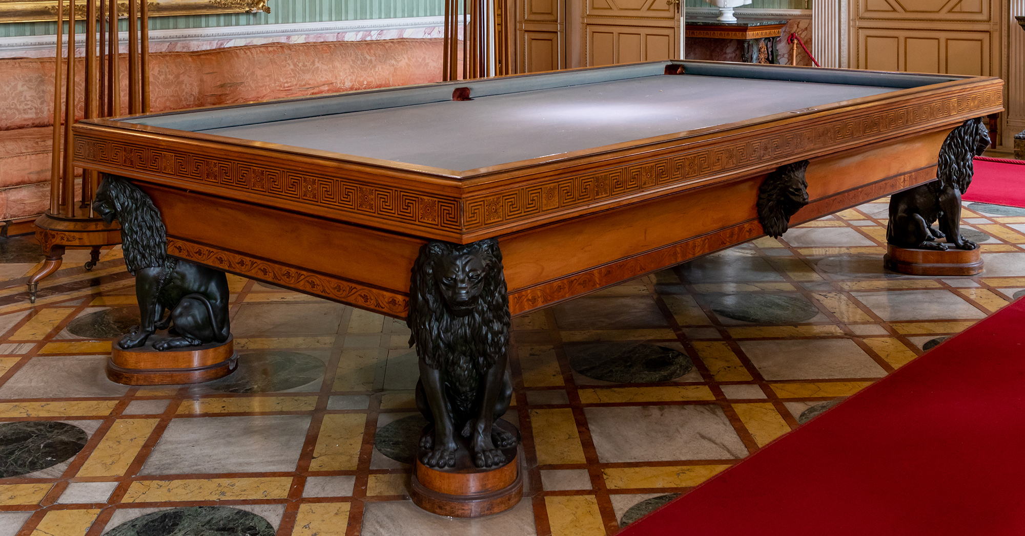 - NOTIZIE STORICO CRITICHE L'oggetto fa parte dell'arredo della Sala da Biliardo voluta da Carlo Alberto nell'ambito dei lavori di ampliamento e riarredo del Castello di Racconigi intorno al 1834, affidati alla progettazione di Pelagio Palagi. Il tavolo venne fornito dalla Fabbrica Fratelli Deagostini di Torino, e realizzato con la decorazione comune a tutti gli oggetti presenti nell'ambiente. Rispetto ad altri tavoli da bigliardo della medesima epoca, si nota in questo esemplare la ricercatezza decorativa che assume il compito di mascherare la funzionalità del tavolo da gioco con i particolari, ed esempio nelle teste dei leoni con la mascella mobile, funzionale al recupero delle palle da biliardo