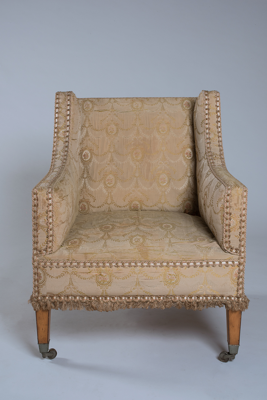 La poltrona poggia su quattro gambe in legno, su rotelle metalliche, e si presenta con ampio sedile quadrato e schienale uguale, leggermente inclinato; due alti braccioli imbottiti terminano in modo netto; tutta la poltrona è foderata in seta gros operata a motivi di ovali in ghirlande rette da festoni floreali, nei colori del bianco di sfondo, verde, giallo e rosso. Tutto il profilo dell'imbottitura è bordato di passamaneria fermata da chiodini metallici