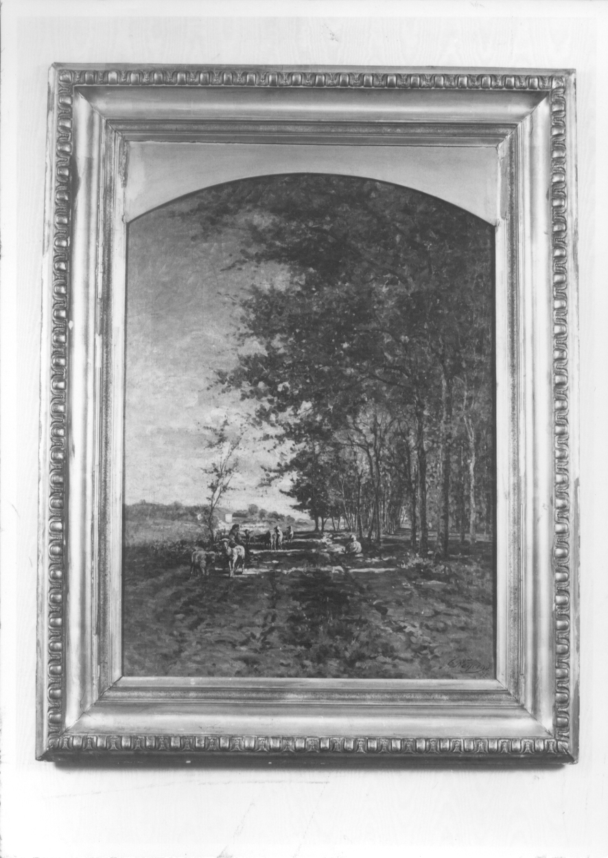 Una strada sterrata si apre tra i campi, a sinistra e un bosco di alberi ad alto fusto sulla destra. Una pastorella la percorre con le sue pecore. Sullo sfondo, si intravedono alcune case su un'altura.Cornice XIX con decorazione a stucco di ovuli