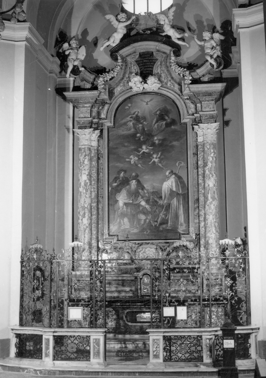- NOTIZIE STORICO CRITICHE L'altare è riferibile, secondo l'iscrizione nella cartella apicale, al 1743, quando veniva dedicato dal Capitolo ai Santi Donato e Guglielmo. Si conserva in Archivio Capitolare il progetto firmato (ma senza data) dall'architetto Giovanni Battista Borra, che ci appare oggi con qualche variante (Dario Barbero, Gabriele Protti, Ad Usum Fabricae architetti, nobili e santi alla Cattedra di Eusebio, Vercelli 2000, p. 60). Al posto dei due bracieri terminali, sul dossale compaiono due angeli in marmo bianco, quello di sinistra reggente una mitra. Anche la mensa è stata recentemente rimaneggiata con apertura di una nicchia centrale che ospita attualmente le reliquie del Beato Pollo
