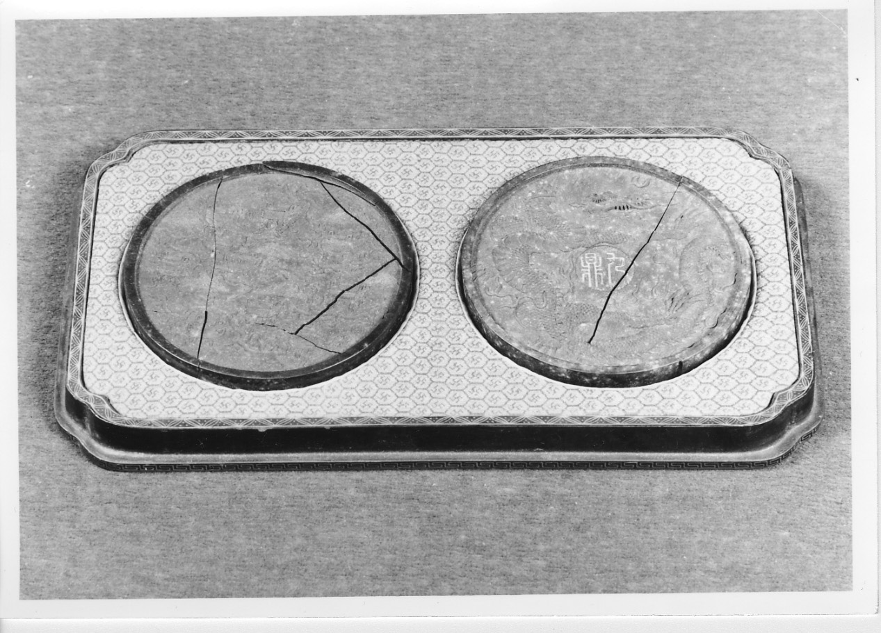 Rettangolare con angoli smussati. Il corpo della scatola scompare quasi interamente nel coperchio. Decorata con figure di draghi che si stagliano su un fondo di nuvole e foglie. All'interno sono conservati due medaglioni di forma circolare con raffigurazioni di carattere orientale ed ideogrammi