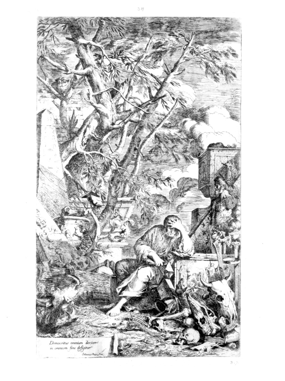 Soggetti profani. Personaggi: Democrito. Elementi architettonici: urne; piramide. Oggetti: ossa; bucranio; libro. Piante