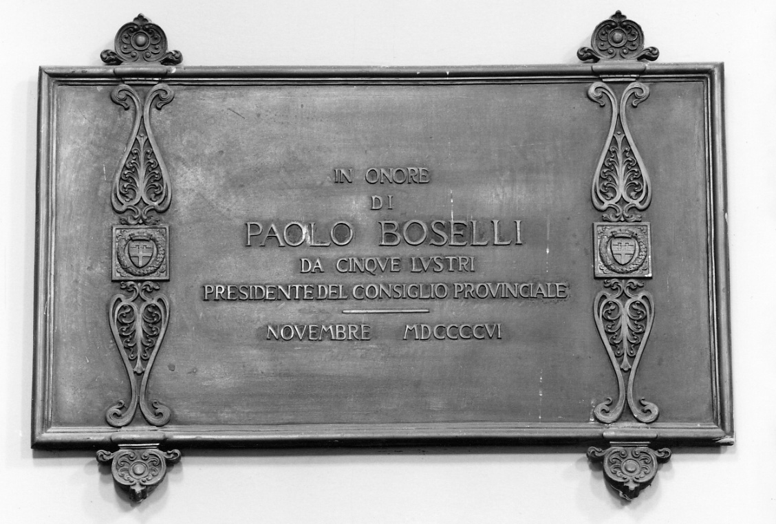 - NOTIZIE STORICO CRITICHE Paolo Boselli (Savona, 1838-Roma, 1923) fu personaggio rilevante della politica italiana nell'ultimo quarto del XIX secolo e nel primo del secolo successivo, ricoprì la carica di Presidente della Provincia di Torino dal 1882 alla morte (R. Romanelli, voce Boselli, Paolo, in Dizionario Biografico degli Italiani, vol. 13, Roma, 1971, pp. 241-251). Il Boselli, infatti, non solo si prodigò ampiamente per la propria provincia d'origine Savona, in qualità di deputato e di ministro, ma dall'ultimo decennio del XIX secolo, elesse a suo centro di interesse privilegiato la città di Torino e, proprio nel 1906, potè vedere la fondazione del Politecnico, alla quale aveva ampiamente contribuito. Nel 1915 divenne Presidente del Consiglio, e nel 1921 ottenne un seggio al senato. Al momento, non sono ancora stati reperiti documenti circa la committenza della targa. Da un punto di vista stilistico, la scelta dei caratteri e la sobrietà del decoro, appaiono caratteristici della cultura figurativa Liberty di inizio Novecento. La targa è stata pubblicata, senza alcun riferimento alla committenza, in P. E. Fiora di Cento Croci, La Provincia di Torino e l'antico palazzo delle Segreterie di Stato, Torino, 2003, p. 28