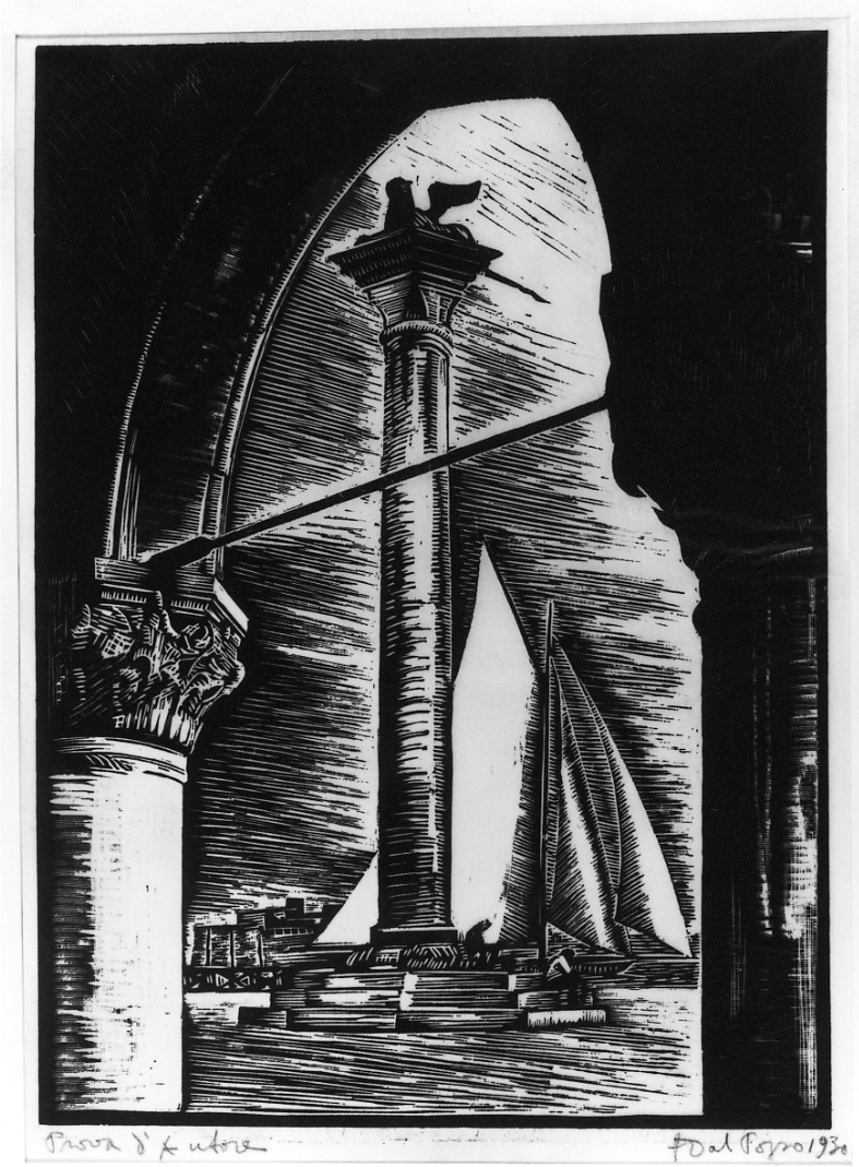 - NOTIZIE STORICO CRITICHE L'opera venne donata alla Provincia di Torino nel 1971, unitamente ad altre incisioni e disegni raccolti dal Centro Piemontese di studi di arte moderna e contemporanea, dalla Cassa di Risparmio di Torino. La raccolta, comprensiva di esemplari eterogenei per provenienza e per datazione, venne sin dall'origine destinata ad essere conservata presso la Biblioteca di Storia e Cultura del Piemonte Giuseppe Grosso. L'autore, (Bologna, 1891-?), diplomatosi all'Accademia di Belle Arti della città natale, si occupò di arti decorative, pittura e scultura. Incominciò ad incidere nel 1927, apprendendo la pratica xilografica all'Accademia d'Arte del Siam, ove si era recato per un viaggio di studio e dal quale verranno tratte una serie di incisioni ed acquerelli che gli faranno meritare l'attenzione della rivista "Emporium" nel 1930, in occasione dell'esposizione degli stessi a Parigi, ove si sottolineava l'onestà di visione e la chiarezza tecnica. Il quarto ed il quinto decennio del secolo hanno visto la sua affermazione con presenze alle Biennali veneziane, alle quadriennali romane e con acquisti da parte delle gallerie d'arte moderna di Bologna e di Milano. L'esemplare in esame si colloca poco dopo la realizzazione delle incisioni di soggetto orientale, con le quali condivide, oltre alla tecnica, anche il segno netto e rifinito ed il taglio scorciato della composizione, e potrebbe far parte di una cartella realizzata per conto dei Buratti di Torino integralmente dedicata alla città di Venezia, Cronache, in "Emporium", vol. LXXI, gennaio, Bergamo 1930, pp. 59-60;L. Servolini, Dizionario degli incisori italiani moderni e contemporanei, Milano, 1955, p. 240. La descrizione dettagliata del soggetto si trova in Annotazioni