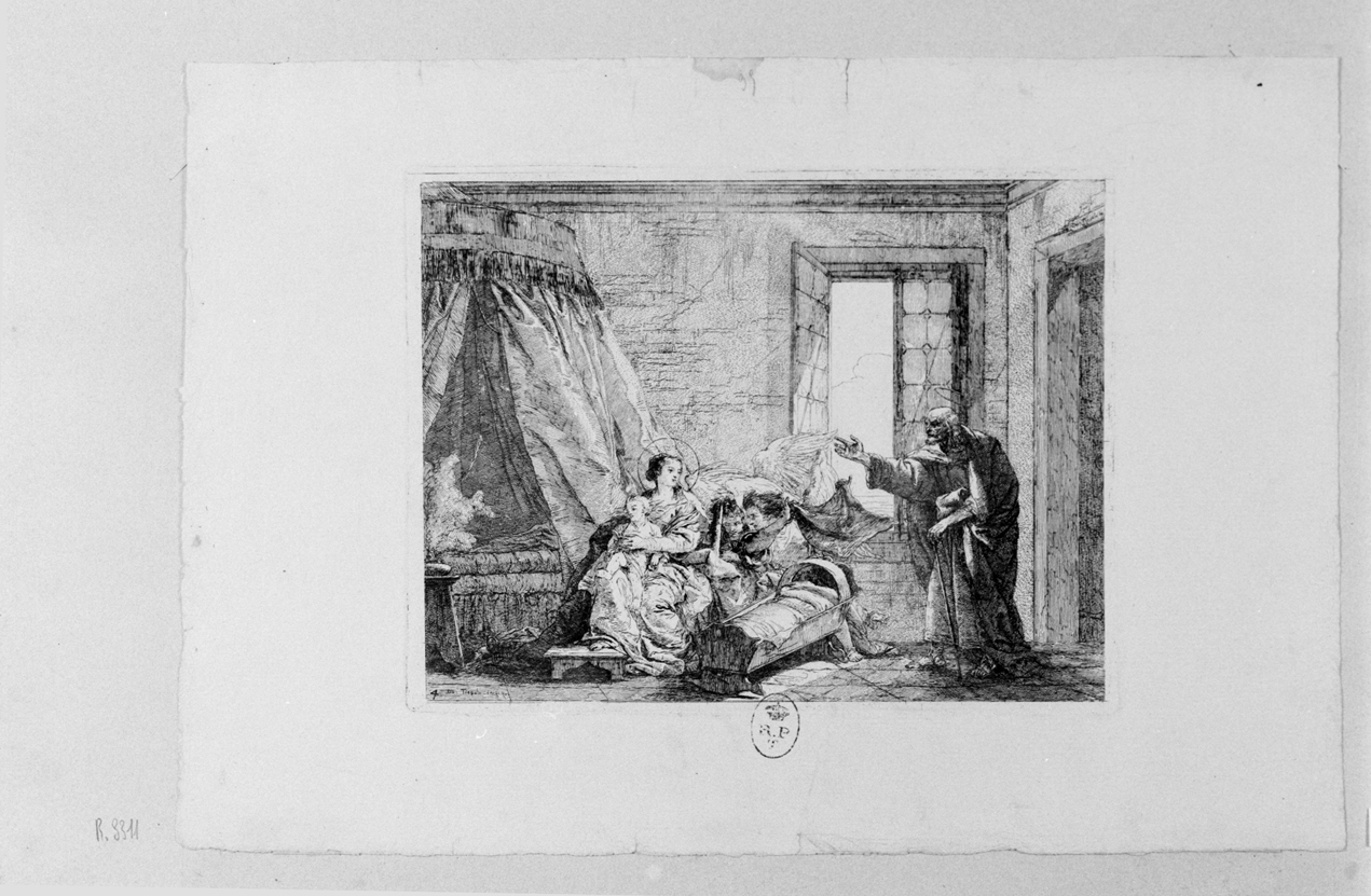 - NOTIZIE STORICO CRITICHE L'incisione rappresenta San Giuseppe in un ambiente domestico che annuncia a Maria la partenza imminente per l'Egitto; fimata due volte (in basso a sinistra ed in alto a destra) e numerata (4), fu erroneamente attribuita al padre Giovanni Battista (NAGLER, 1847, p. 7). Si rimanda alla scheda specifica dell'acquaforte in RIZZI, 1971, n. 70. Dalle annotazioni sugli inventari della Pinacoteca risulta che l'incisione fu donata al museo da Giovanni Vico nel 1879. La stampa è ancora conservata nell'Album 30 (Stampe di scuola veneziana H/1), foglio 7, secondo l'ordinamento dato alla raccolta delle incisioni della Galleria Sabauda da Francesco Gamba nel 1885