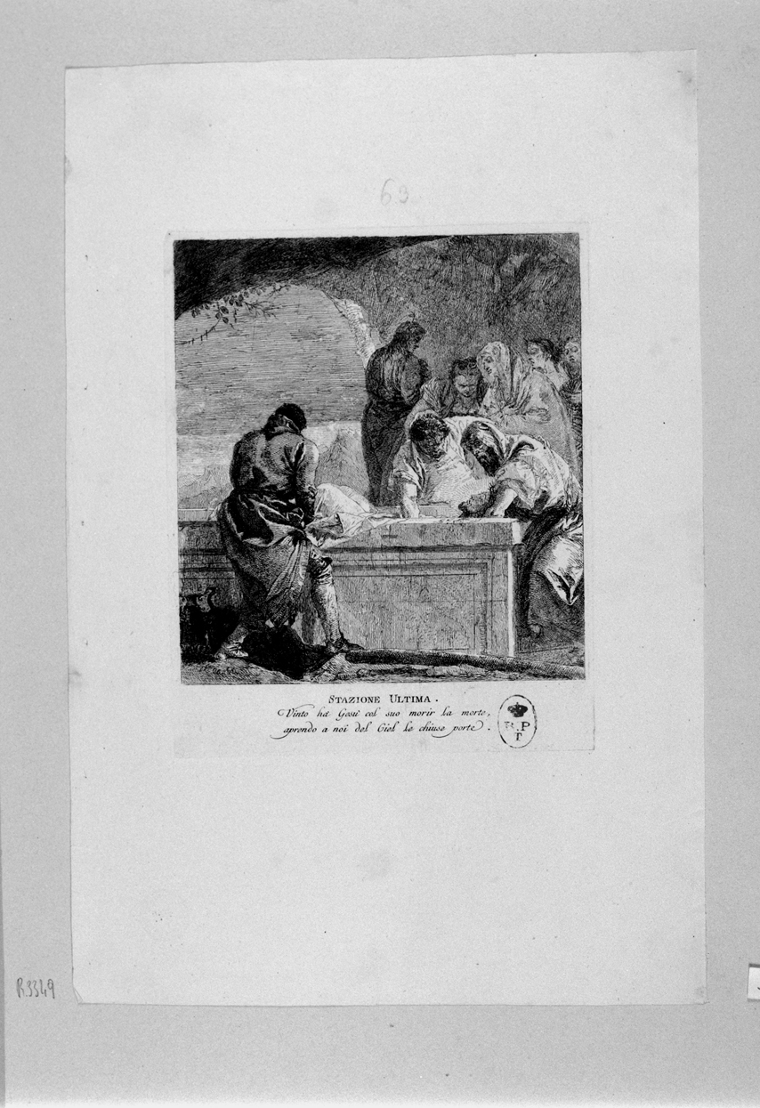 - NOTIZIE STORICO CRITICHE L'incisione, raffigurante la sepoltura di Gesù, deriva dalla tela di medesimo soggetto, dipinta da Domenico nell'Oratorio del Crocifisso della Chiesa di San Polo in Venezia, tra il 1747 e il 1748 (RIZZI, 1971, scheda n. 54).Dalle annotazioni sugli inventari della Pinacoteca risulta che l'incisione fu donata al museo da Giovanni Vico nel 1882. La stampa è ancora conservata nell'Album 30 (Stampe di scuola veneziana H/1), foglio 46, secondo l'ordinamento dato alla raccolta delle incisioni della Galleria Sabauda da Francesco Gamba nel 1885