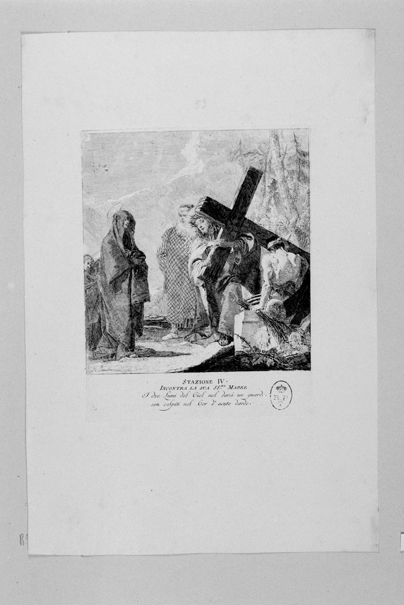 - NOTIZIE STORICO CRITICHE l'incisione, raffigurante l'incontro di Gesù con la Madonna, deriva dalla tela di medesimo soggetto, dipinta da Domenico nell'Oratorio del Crocifisso della Chiesa di San Polo in Venezia, tra il 1747 e il 1748; esistono inoltre tre disegni dell'artista correlati alla Stazione IV della Via Crucis, segnalati da Knox: il primo si trova a Wurzburg, presso il Martin von Wagner Museum; gli altri due sono conservati a Venezia, al Museo Correr (cfr. KNOX, 1980, v. I n. E. 73, D. 23, D. 24; ibidem, v. II tav. 82, 83 e 84; RIZZI, 1971, scheda n. 44).Dalle annotazioni sugli inventari della Pinacoteca risulta che l'incisione fu donata al museo da Giovanni Vico nel 1885. La stampa è ancora conservata nell'Album 30 (Stampe di scuola veneziana H/1), foglio 36, secondo l'ordinamento dato alla raccolta delle incisioni della Galleria Sabauda da Francesco Gamba nel 1885