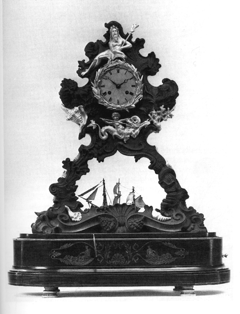 Un orologio di bronzo color naturale, con alla sommità in bronzo dorato la figura di Nettuno, a destra una conchiglia, a sinistra un rametto di corallo e sotto putto su cavallo marino. Nella parte inferiore vi è un apertura dove è stato collocato un vascello azionato da un meccanismo collegato a un organetto i cui meccanismi sono inseriti nel basamento ovale di legno intarsiato sul davanti con due figure allegoriche su conchiglie trainate da delfini e incorniciate da volute di foglie d'acanto. Esso poggia su quattro piedini torniti.Decorazione: intorno al quadrante un festone di giunchi avvitati sull'orologio conchiglie, coralli, figura di Nettuno e putto sul cavallo marino e ai lati griglie a volute; tutti questi elementi sono dorati. Sul davanti della base vi sono intarsi di legno chiaro raffiguranti divinità marine entro decorazioni floreali.Montaggio: tutti i motivi in bronzo dorato sono avvitati.Movimento: tipo Parigi, diametro 82 mm. Scappamento ad ancora piccola. Pendolo tipico. Sospensione a filo regolabile da tergo. Forchetta con una punta a gancio e l'altra liscia. Partitora.Il grande carillon contenuto nella base lignea è indipendente dal movimento dell'orologio e si aziona a richiesta mediante levetta facendo beccheggiare il piccolo veliero