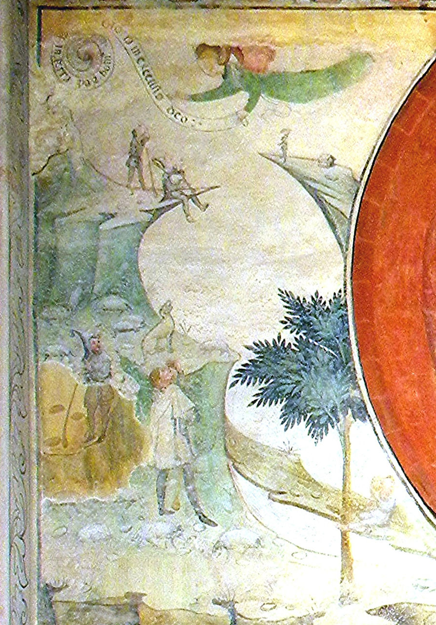 • NOTIZIE STORICO CRITICHE La costruzione di questa sacrestia è riferibile alla fine del Seicento, quando si decise di ricavare un vano addossato al lato esterno della cappella di San Pantaleone e dell'abside, dove in precedenza era presente il cimitero dei bambini. Si appoggiò allora una nuova muratura sul grande rosone, sulla ricca decorazione superiore in terracotta, che continuava quella esterna dell'edificio e sul grande affresco.Andreina Griseri, osservando l'affresco un tempo rappresentato nella parete esterna della chiesa, notava affinità stilistiche con il codice di Ercole I d'Este. Elena Brezzi Rossetti, considerando "la minuta rappresentazione dei cani e delle pecore che pascolano tra i ciuffi d'erba", ipotizzava un rapporto stringente con la miniatura lombarda (già osservato, nella stessa campagna decorativa, nella scena del martirio di San Pantaleone). Dal punto di vista stilistico, la presente raffigurazione, all'interno della decorazione delle due cappelle (quarta e quinta), viene considerata come un intervento più raffinato, rispetto ad altre mani riconoscibilmente più corsive e meno espressive