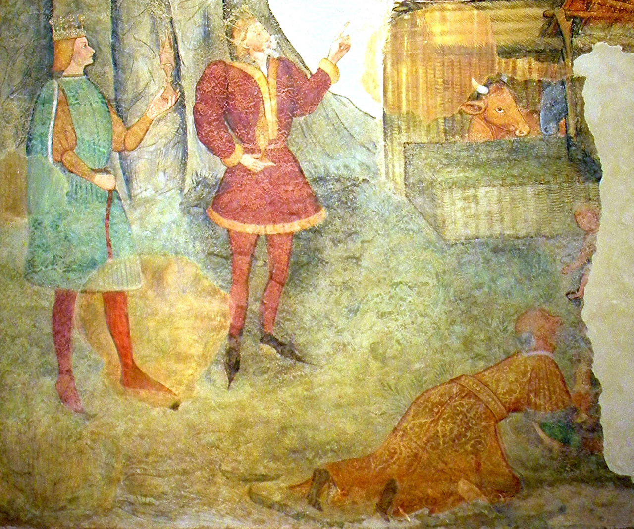 La grande composizione, che si estende all'intera parete, interrotta solo al centro dal grande rosone in terracotta, raffigura in primo piano i tre Re Magi, vestiti alla moda del tempo, dei quali uno è genuflesso, mentre gli altri due in piedi indicano la stella posta sopra la capanna. Tengono in mano le ampolle con i tradizionali doni, mentre risulta illeggibile la raffigurazione della Sacra Famiglia, in basso a destra, a causa di un'apertura praticata verso la chiesa (si vede solo Gesù Bambino, tenuto probabilmente in braccio dalla Madonna). Nella capanna, di cui rimane visibile solo parte del tetto, si scorgono le figure del bue e dell'asinello, di fronte alla mangiatoia. Il paesaggio roccioso è realisticamente disegnato con pastori e alberi; in particolare, sulla sinistra un angelo in volo reca un cartiglio con un'iscrizione, verso il quale rivolgono lo sguardo un pastore intento a suonare una cornamusa a cavalcioni di una roccia, un altro che sta bevendo ed addirittura un cane. Nella parte opposta si distingue la stella a sua volta osservata da due pastori, uno dei quali è intento a scalare la roccia per avvicinarsi di più alla sacra apparizione. Sul pilastro a sinistra erano raffigurati due santi; per quello in alto si ipotizza l'identificazione (continua in OSS)